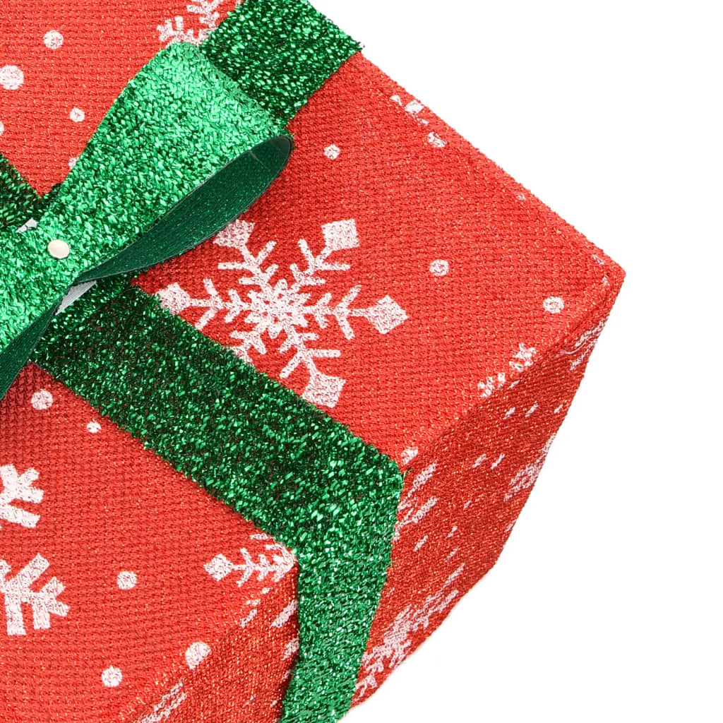 Décorez votre espace avec ces boîtes de Noël lumineuses à l'approche de Noël. 8 modes d'éclairage : le cadeau de Noël illuminé a 8 effets lumineux différents (combinaison, en vague, séquentiel, lueur lente, eau chassée/courante, fondu lent, scintillement/flash et allumage continu), vous pouvez changer les modes d'éclairage en appuyant sur le bouton de l'USB pour créer différentes ambiances de vacances.Set de 3 boîtes : le set se compose de 3 boîtes de Noël de tailles différentes. Chaque boîte est nouée avec un joli nœud sur le dessus, ce qui lui donne l'apparence d'une vraie boîte à cadeaux.64 lumières LED : l'ensemble de 3 coffrets cadeau lumineux est livré avec 64 lumières LED à économie d'énergie au total, qui brillent depuis l'intérieur et reflètent leur lumière blanche chaude à travers la coque colorée.Affichage polyvalent : la boîte de Noël lumineuse fait un excellent supplément sous l'arbre de Noël, s'harmonisant joliment aux autres cadeaux et décorations. De plus, elle peut être utilisée comme décoration dans votre salon, bureau, appartement, atelier, restaurant et plus encore. Bon à savoir :Ce produit est doté d'un connecteur USB, mais la source d'alimentation certifiée de USB 5V n'est pas incluse.