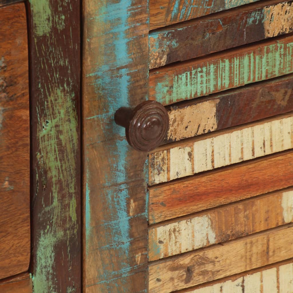 Ce buffet en bois, au look intemporel, est conçu pour être un excellent supplément à votre maison. Bois massif de récupération : le bois massif de récupération se compose de bois réutilisés tels que le teck, le manguier, le pin et le hêtre. Ces matériaux sont recyclés à partir d'anciens bâtiments tels que des usines, des remises et des bateaux. Comme chaque pièce est faite à la main, les couleurs varient pour chaque produit. Fabriquée en bois de récupération massif, l'armoire est durable et belle.Grand espace de rangement : avec 3 tiroirs et 2 compartiments, le buffet offre un grand espace de rangement pour garder vos différents articles essentiels quotidiens bien organisés et facilement accessibles.Fonction d'affichage : le dessus du placard est idéal pour exposer vos objets décoratifs, albums photo ou petites plantes. Bon à savoir : Les couleurs et les grains varient d'une pièce de meuble à l'autre, ce qui rend chaque pièce unique. La livraison est aléatoire, ce qui garantit l'exclusivité et l'individualité de votre produit. Attention :Pour éviter qu'il ne soit renversé, ce produit doit être utilisé avec le dispositif de fixation au mur fourni.