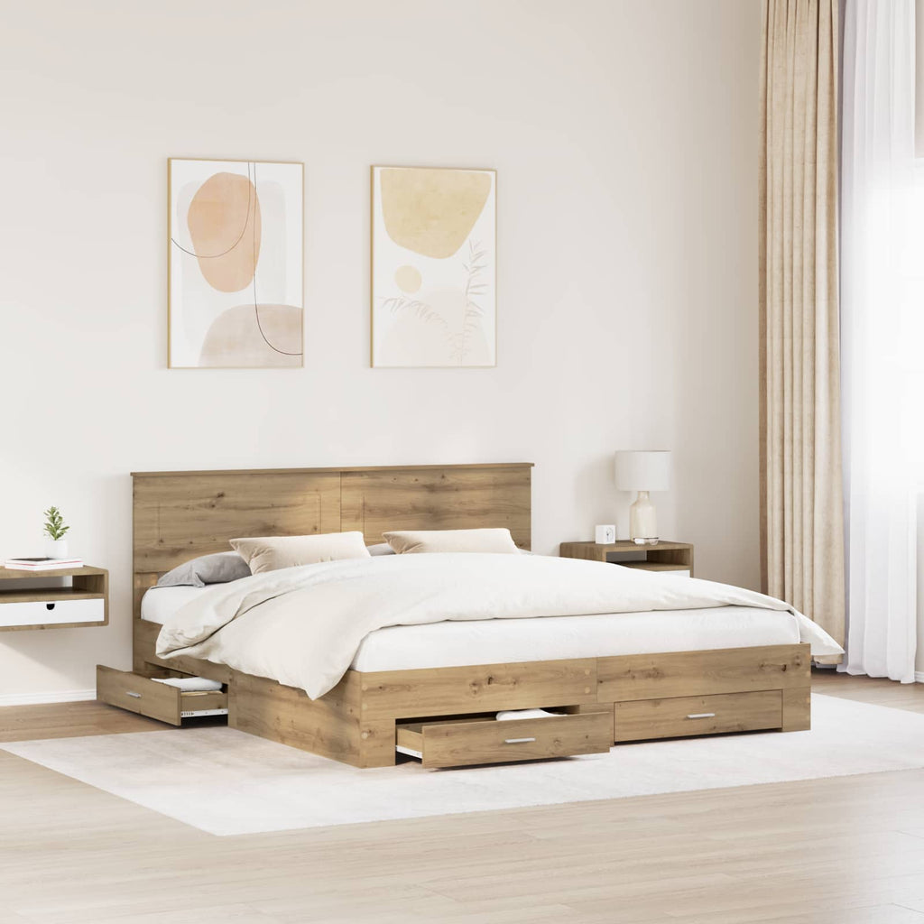 Ce cadre de lit de rangement moderne est à la fois simple et pratique, reflet du style moderne. Créé pour les chambres qui veulent allier espace et esthétique, il mélange fonction et design avec ses lignes épurées. Parfait pour ceux qui veulent une touche stylée sans trop de complication, ce lit apporte une belle amélioration à votre coin sommeil. Dès le premier coup d'œil, son design clair et minimaliste parle aux tendances d'aujourd'hui, faisant de lui l'ajout idéal pour les appart’ citadins, les modernes maisons ou les chambres aux looks actuels. Construction en bois d'ingénierie Ce lit est fabriqué avec du bois d'ingénierie, un matériau reconnu pour sa stabilité et sa solidité. Sa finition moderne apporte une touche de classe à n'importe quel coin tout en s'assurant qu'il reste solide au quotidien. Cela signifie que vous avez un beau lit qui tiendra le coup dans toutes les situations. Tiroirs de rangement intégrés Il a été pensé pour le rangement, avec des tiroirs conçus avec le même bois qui s'intègre parfaitement au lit. Ces tiroirs ont beaucoup de place pour garder vos draps, vêtements ou autres objets, réduisant le désordre et optimisant l'espace. Les poignées traditionnelles des tiroirs permettent d'accéder facilement à vos affaires. Tête de lit incluse Avec sa tête de lit en bois d'ingénierie, elle donne une belle finition au lit. Elle est à la fois décorative et un peu pratique, pour que vous puissiez vous adosser confortablement en lisant ou en regardant la télé. Son design minimaliste va parfaitement avec le lit, améliorant l'ambiance de la chambre. Entretien & nettoyage faciles La surface de ce lit se nettoie facilement avec un chiffon humide, rendant le ménage super simple. Les instructions d’entretien sont simples pour que votre lit reste frais et joli sans trop d’effort, et vous pouvez profiter de son élégance sans prise de tête. Processus d'assemblage pratique L'assemblage est rapide et nécessite juste deux personnes et un tournevis. Chaque pièce est bien pensée pour que ce soit facile à monter, vous offrant une expérience de mise en place agréable et efficace pour profiter de votre nouveau lit.