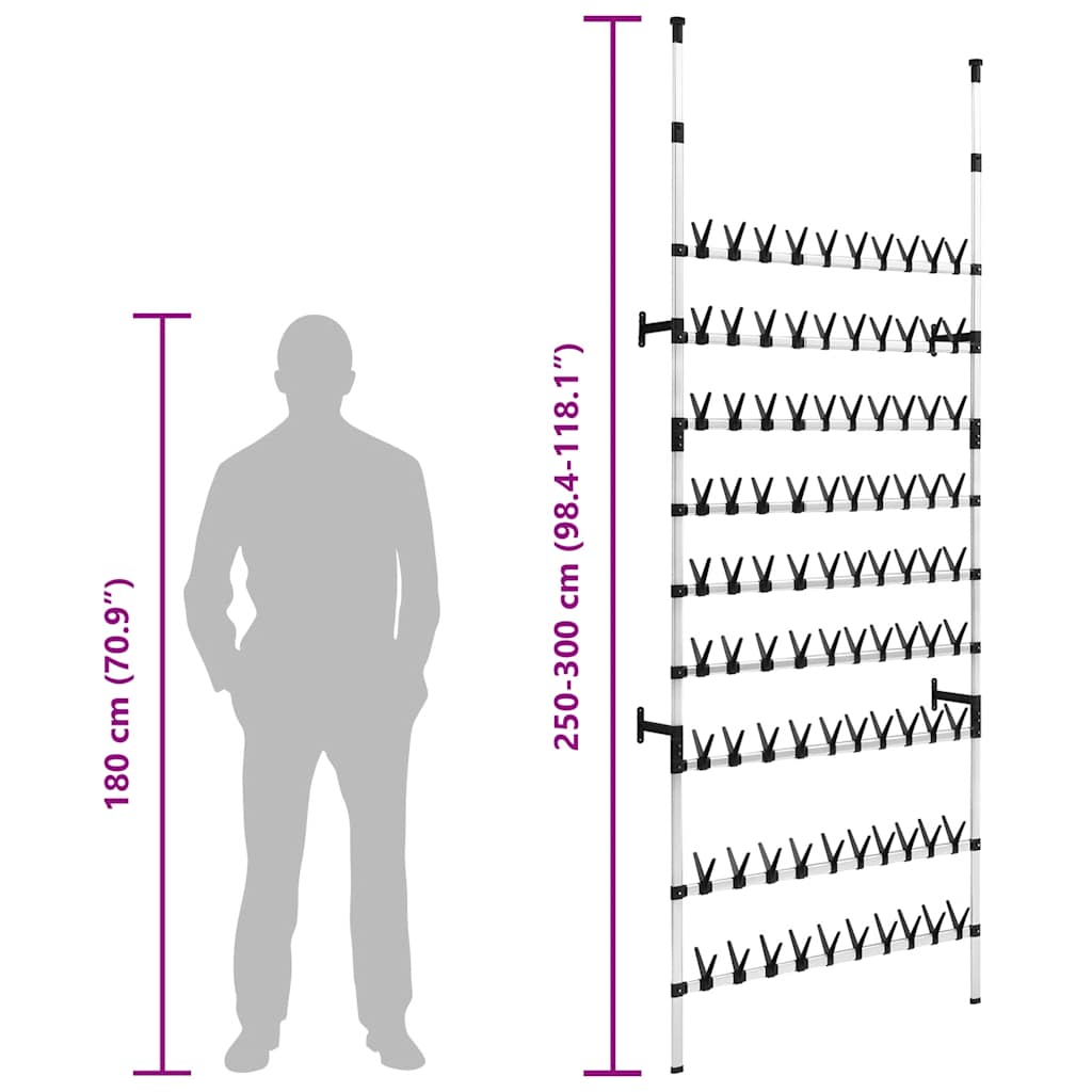 Cette étagère à chaussures minimaliste est une solution de rangement idéale pour vos chaussures. Le support à chaussures télescopique est en aluminium, ce qui le rend robuste et fort. Ce meuble de rangement peut être adaptable à différents aménagements spatiaux, grâce à son système télescopique et à la hauteur et la largeur réglables. Il offre un moyen unique et polyvalent d'organiser vos chaussures et de gagner de la place. Cet organisateur de chaussures est conçu pour 90 paires de chaussures.