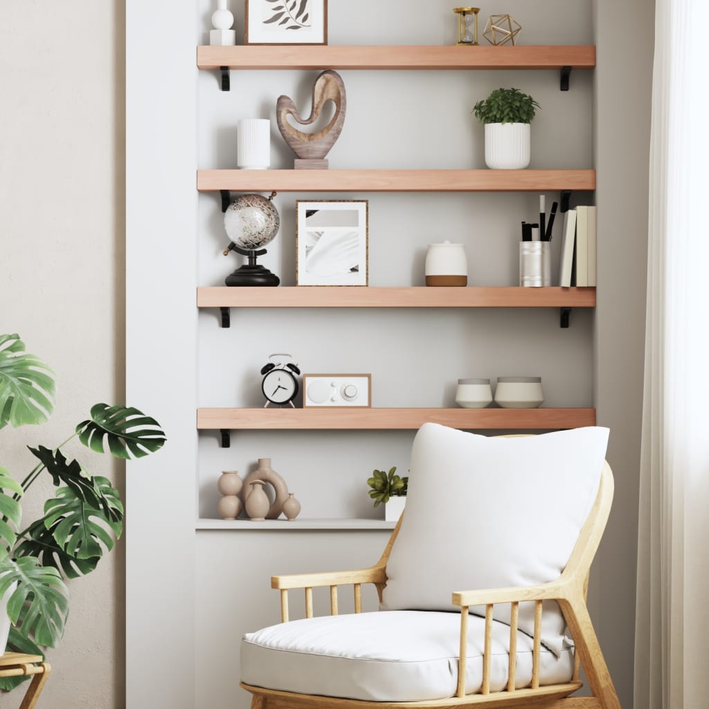 Avez-vous besoin de plus de possibilités de stockage mais n’avez pas d’espace ? Cette étagère murale de style rustique est la solution idéale. Construction durable : l'étagère murale est fabriquée en bois de chêne massif, un matériau naturel magnifique. Le bois de chêne a une couleur marron moyen et un grain dense, ce qui contribue à son aspect unique.Applications polyvalentes : en plus d'une étagère, cette étagère de rangement peut être combinée avec différentes bases selon vos besoins. Elle peut être utilisée comme dessus de salle de bain, tablette d'armoire, étagère de bureau, dessus de table, etc.Surface traitée : l'étagère en bois a été vernie, elle est donc prête à l'emploi car une finition supplémentaire n'est pas nécessaire.Fabriquée à la main avec un bord vif : cette étagère est fabriquée à la main avec un bord vif. Les nœuds, les fissures, les formes légèrement incurvées et les tons de couleur font partie du bois de chêne, ce qui confère à chaque étagère un caractère unique. La livraison est aléatoire, ce qui garantit l'exclusivité et l'individualité de votre produit. Bon à savoir :En tant que produit naturel, le bois peut présenter des nœuds et des imperfections que nous remplissons avec des garnitures noires pour garantir un aspect lisse.