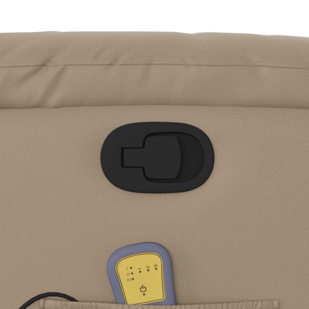 Asseyez-vous et détendez-vous dans ce fauteuil inclinable de massage très confortable ! Fonction d'inclinaison manuelle : ce fauteuil inclinable est doté d'une poignée du côté droit. Vous pouvez régler manuellement le repose-pieds et le dossier dans n'importe quelle position selon votre confort en tirant simplement sur la poignée. Cette fonction permet une inclinaison maximale de 135 degrés. De plus, le dossier peut revenir rapidement à sa position d'origine en tirant simplement sur la poignée.Fonction de vibration : les 6 points de massage vous permettent de faire l'expérience d'un massage mieux ciblé. De plus, la télécommande incluse vous permet de choisir différents programmes de massage. La fonction de massage est alimentée par le connecteur USB, mais la source d'alimentation USB 5V certifiée n'est pas incluse.Expérience de siège confortable : le siège, le dossier et les larges accoudoirs rembourrés épais recouverts de similicuir procurent une sensation confortable, vous faisant vous sentir enlacé lorsque vous êtes assis. Le similicuir est un matériau très résistant. Il est résistant aux taches, ce qui le rend facile à nettoyer avec un chiffon humide. La surface lisse donne également un aspect luxueux et la beauté du cuir véritable.Poche latérale pratique : ce fauteuil est doté d'une poche latérale pour ranger votre télécommande ou garder vos objets essentiels à portée de main.Cadre solide et stable : le cadre en bois et en métal offre une structure solide et une grande stabilité. Ce fauteuil inclinable est confortable et durable.