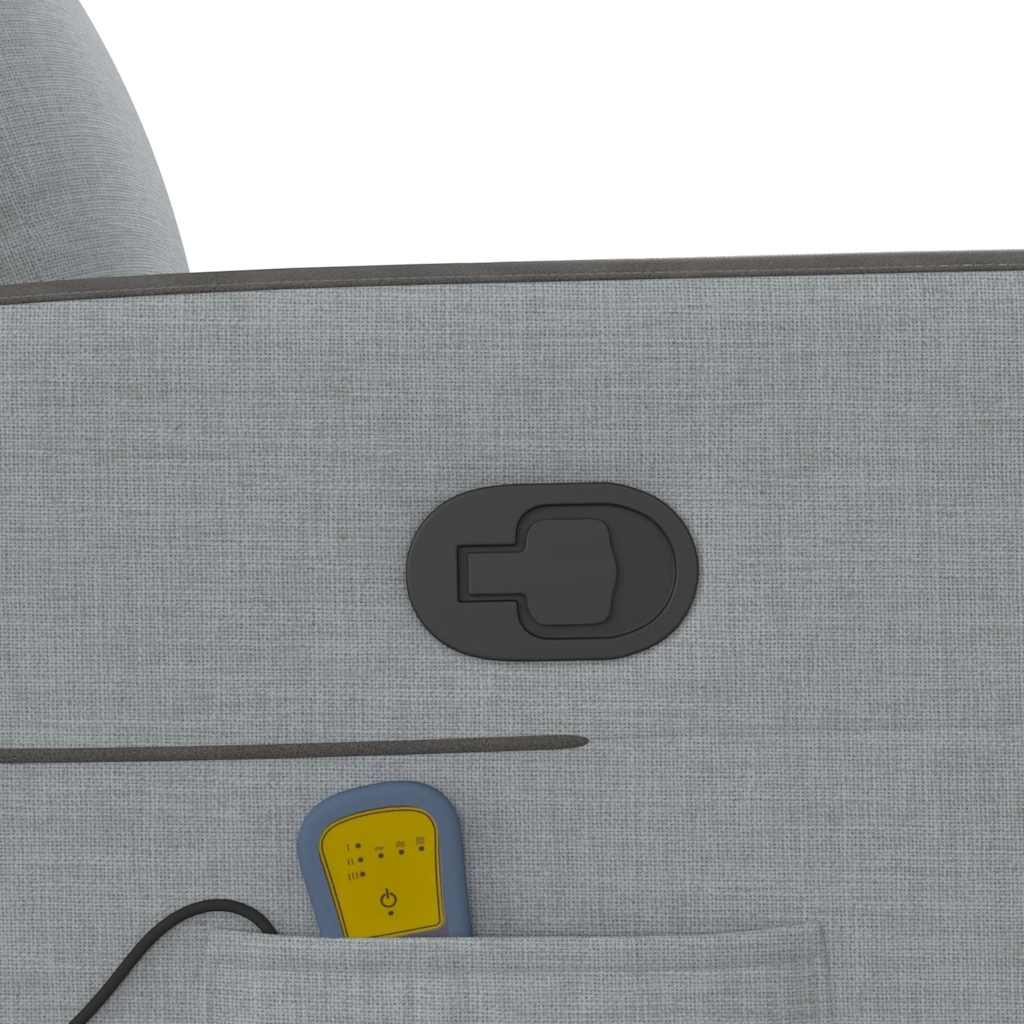 Asseyez-vous et détendez-vous dans ce fauteuil inclinable de massage très confortable ! Fonction d'inclinaison manuelle : ce fauteuil inclinable est doté d'une poignée du côté droit. Vous pouvez régler manuellement le repose-pieds et le dossier dans n'importe quelle position selon votre confort en tirant simplement sur la poignée. Cette fonction permet une inclinaison maximale de 135 degrés. De plus, le dossier peut revenir rapidement à sa position d'origine en tirant simplement sur la poignée.Fonction de vibration : les 6 points de massage vous permettent de faire l'expérience d'un massage mieux ciblé. De plus, la télécommande incluse vous permet de choisir différents programmes de massage. La fonction de massage est alimentée par le connecteur USB qui nécessite une source d'alimentation USB certifiée de 5 V (non fournie).Expérience d'assise confortable : le siège, le dossier et les larges accoudoirs bien rembourrés recouverts de tissu procurent une sensation confortable et chaleureuse, vous permettant de vous sentir enveloppé lorsque vous êtes assis. Le tissu présente un aspect simple et épuré et est respirant et durable.Poche latérale pratique : ce fauteuil est doté d'une poche latérale pour ranger votre télécommande ou garder vos objets essentiels à portée de main.Cadre solide et stable : le cadre en bois et en métal offre une structure solide et une grande stabilité. Ce fauteuil inclinable est confortable et durable.