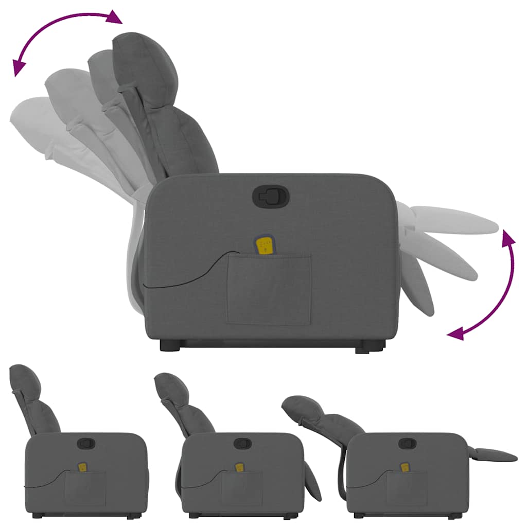Asseyez-vous et détendez-vous dans ce fauteuil inclinable de massage très confortable ! Fonction de levage électrique : ce fauteuil inclinable pour personnes âgées est équipé d'un moteur électrique pour la fonction de levage. Grâce à la fonction qui pousse toute la chaise vers le haut, vous pouvez facilement vous tenir debout sans stresser votre dos et vos genoux en appuyant simplement sur le bouton.Fonction d'inclinaison manuelle : ce fauteuil inclinable est doté d'une poignée du côté droit. Vous pouvez régler manuellement le repose-pieds et le dossier dans n'importe quelle position selon votre confort en tirant simplement sur la poignée. Cette fonction permet une inclinaison maximale de 135 degrés. De plus, le dossier peut revenir rapidement à sa position d'origine en tirant simplement sur la poignée.Fonction de vibration : les 6 points de massage vous permettent de faire l'expérience d'un massage mieux ciblé. De plus, la télécommande incluse vous permet de choisir différents programmes de massage. La fonction de massage est alimentée par le connecteur USB qui nécessite une source d'alimentation USB certifiée de 5 V (non fournie).Expérience d'assise confortable : le siège, le dossier et les larges accoudoirs bien rembourrés recouverts de tissu procurent une sensation confortable et chaleureuse, vous permettant de vous sentir enveloppé lorsque vous êtes assis. Le tissu présente un aspect simple et épuré et est respirant et durable.Poche latérale pratique : ce fauteuil est doté d'une poche latérale pour vous permettre de garder vos objets essentiels à portée de main.Cadre solide et stable : le cadre en bois et en métal offre une structure solide et une grande stabilité. Ce fauteuil inclinable est confortable et durable.