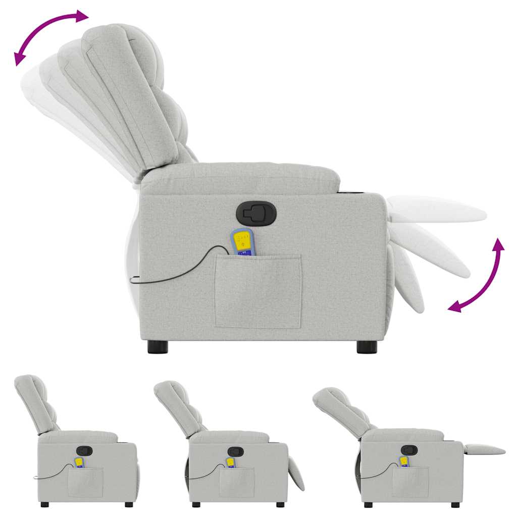 Asseyez-vous et détendez-vous dans ce fauteuil inclinable de massage très confortable ! Fonction d'inclinaison manuelle : ce fauteuil inclinable est doté d'une poignée du côté droit. Vous pouvez régler manuellement le repose-pieds et le dossier dans n'importe quelle position selon votre confort en tirant simplement sur la poignée. Cette fonction permet une inclinaison maximale de 135 degrés. De plus, le dossier peut revenir rapidement à sa position d'origine en tirant simplement sur la poignée.Fonction de vibration : les 6 points de massage vous permettent de faire l'expérience d'un massage mieux ciblé. De plus, la télécommande incluse vous permet de choisir différents programmes de massage. La fonction de massage est alimentée par le connecteur USB, mais la source d'alimentation USB 5V certifiée n'est pas incluse.Expérience d'assise confortable : le siège, le dossier et les larges accoudoirs bien rembourrés recouverts de tissu procurent une sensation confortable et chaleureuse, vous permettant de vous sentir enveloppé lorsque vous êtes assis. Le tissu présente un aspect simple et épuré et est respirant et durable.Poche latérale pratique : ce fauteuil est doté d'une poche latérale pour ranger votre télécommande ou garder vos objets essentiels à portée de main.Cadre solide et stable : le cadre en bois et en métal offre une structure solide et une grande stabilité. Ce fauteuil inclinable est confortable et durable.