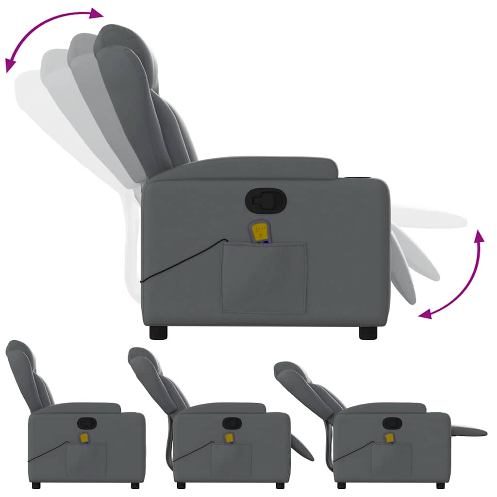 Asseyez-vous et détendez-vous dans ce fauteuil inclinable de massage très confortable ! Fonction d'inclinaison manuelle : ce fauteuil inclinable est doté d'une poignée du côté droit. Vous pouvez régler manuellement le repose-pieds et le dossier dans n'importe quelle position selon votre confort en tirant simplement sur la poignée. Cette fonction permet une inclinaison maximale de 135 degrés. De plus, le dossier peut revenir rapidement à sa position d'origine en tirant simplement sur la poignée.Fonction de vibration : les 6 points de massage vous permettent de faire l'expérience d'un massage mieux ciblé. De plus, la télécommande incluse vous permet de choisir différents programmes de massage. La fonction de massage est alimentée par le connecteur USB, mais la source d'alimentation USB 5V certifiée n'est pas incluse.Expérience de siège confortable : le siège, le dossier et les larges accoudoirs rembourrés épais recouverts de similicuir procurent une sensation confortable, vous faisant vous sentir enlacé lorsque vous êtes assis. Le similicuir est un matériau très résistant. Il est résistant aux taches, ce qui le rend facile à nettoyer avec un chiffon humide. La surface lisse donne également un aspect luxueux et la beauté du cuir véritable.Porte-gobelets et poche latérale pratiques : ce fauteuil dispose de deux porte-gobelets pratiques pour vos boissons et d'une poche latérale pour votre télécommande ou pour garder vos objets essentiels à portée de main.Cadre solide et stable : le cadre en bois et en métal offre une structure solide et une grande stabilité. Ce fauteuil inclinable est confortable et durable.