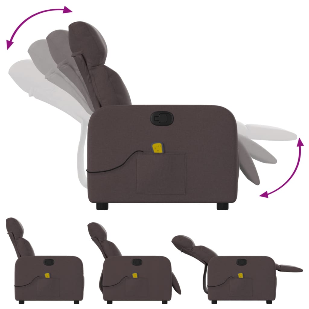 Asseyez-vous et détendez-vous dans ce fauteuil inclinable de massage très confortable ! Fonction d'inclinaison manuelle : ce fauteuil inclinable est doté d'une poignée du côté droit. Vous pouvez régler manuellement le repose-pieds et le dossier dans n'importe quelle position selon votre confort en tirant simplement sur la poignée. Cette fonction permet une inclinaison maximale de 135 degrés. De plus, le dossier peut revenir rapidement à sa position d'origine en tirant simplement sur la poignée.Fonction de vibration : les 6 points de massage vous permettent de faire l'expérience d'un massage mieux ciblé. De plus, la télécommande incluse vous permet de choisir différents programmes de massage. La fonction de massage est alimentée par le connecteur USB, mais la source d'alimentation USB 5V certifiée n'est pas incluse.Expérience d'assise confortable : le siège, le dossier et les larges accoudoirs bien rembourrés recouverts de tissu procurent une sensation confortable et chaleureuse, vous permettant de vous sentir enveloppé lorsque vous êtes assis. Le tissu présente un aspect simple et épuré et est respirant et durable.Poche latérale pratique : ce fauteuil est doté d'une poche latérale pour ranger votre télécommande ou garder vos objets essentiels à portée de main.Cadre solide et stable : le cadre en bois et en métal offre une structure solide et une grande stabilité. Ce fauteuil inclinable est confortable et durable.