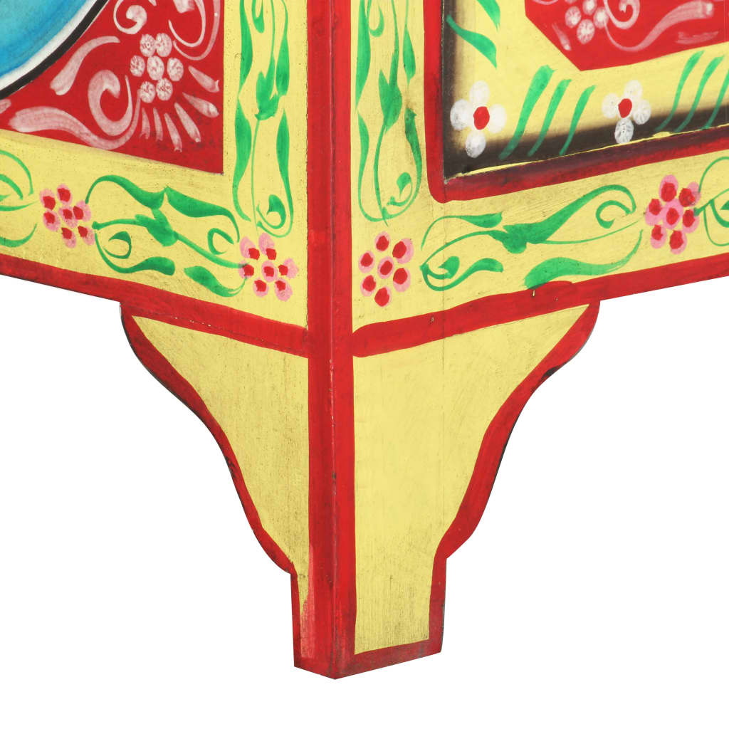 Cette belle table de chevet, ornée de riches décorations peintes à la main, sera un supplément accrocheur à votre chambre à coucher avec son design coloré. La table de chevet est fabriquée en bois de manguier et en MDF qui est à la fois durable et beau, et l'artisanat ajoute à son style rétro spectaculaire. Chaque étape du processus est réalisée avec le plus grand soin, que ce soit le polissage, la peinture ou le laquage. La table de chevet comporte de nombreux détails décoratifs peints à la main, ce qui crée un effet chaleureux et riche. Cette table de chevet a un dessus robuste, sur lequel vous pouvez placer une lampe de chevet, un réveil ou tout ce dont vous pourriez avoir besoin près de votre lit. Les tiroirs offrent suffisamment d'espace pour garder toutes sortes de petits objets organisés et à portée de main. L'article est déjà assemblé ; aucun assemblage n'est requis.