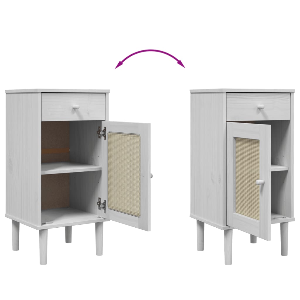 Cette table de chevet tendance en bois, au design élégant et classique, est destinée à améliorer votre intérieur. Bois de pin massif : le bois de pin massif est un matériau naturel magnifique. Le bois de pin a un grain droit et les nœuds donnent au matériau son aspect caractéristique et rustique.Vernis UV : le vernis UV est un type spécial de vernis qui est fini à l'aide d'un séchoir à ultraviolets. Il crée une finition plus vive, plus luxueuse et plus tactile par rapport aux vernis non UV.Grand espace de rangement : la table de chevet dispose d'un tiroir et de 2 compartiments avec une porte, offrant un espace suffisant pour ranger vos magazines, livres, télécommandes et autres petits objets à portée de main.Surface aspect rotin : la surface de la porte de l'armoire de lit est fabriquée à la main en résine tressée, un mélange bicolore de modernité du milieu du siècle et de bohème qui ajoute une touche à la fois douillette et élégante à votre espace.Dessus robuste : le dessus robuste de la table de chevet est idéal pour exposer des objets décoratifs, des cadres photo et des plantes en pot. Attention :Pour éviter qu'il ne soit renversé, ce produit doit être utilisé avec le dispositif de fixation au mur fourni.