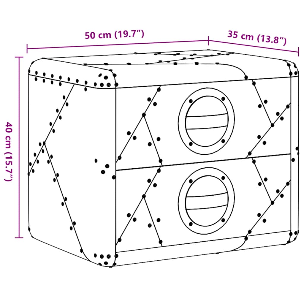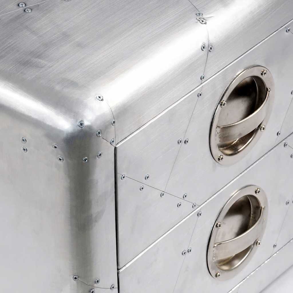 Cette table d'appoint de haute qualité peut être placée dans n'importe quelle pièce. Grâce au design élégant et compact, elle peut également être utilisée comme une table basse, une table de chevet, une table d'extrémité, etc. Cette table d'appoint a deux tiroirs pour les petits objets comme les clés, bloc-notes, stylos et autres bibelots. Le dessus de table peut être utilisé pour placer de la nourriture ou des boissons ou pour exposer des objets décoratifs comme des cadres photo, ou même des plantes en pot. Cette table d'appoint est en bois massif et sa surface est revêtue d'un patchwork de panneaux en aluminium poli, rehaussés de vis en acier exposées, ce qui la rend extrêmement durable. Les bords lisses et les poignées de tiroir rétro donnent à la table d'appoint un aspect unique.